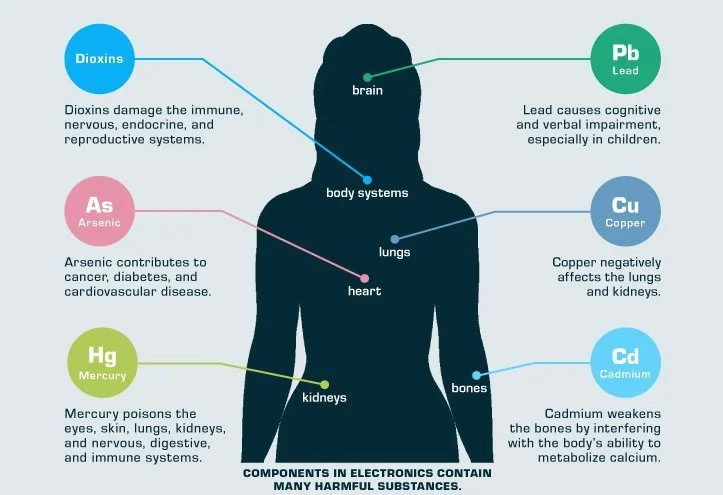 E-waste, in its many forms, has over 1000 chemicals that could potentially produce harm. Find on the side the five most well-known heavy metals and their effects (Scott).