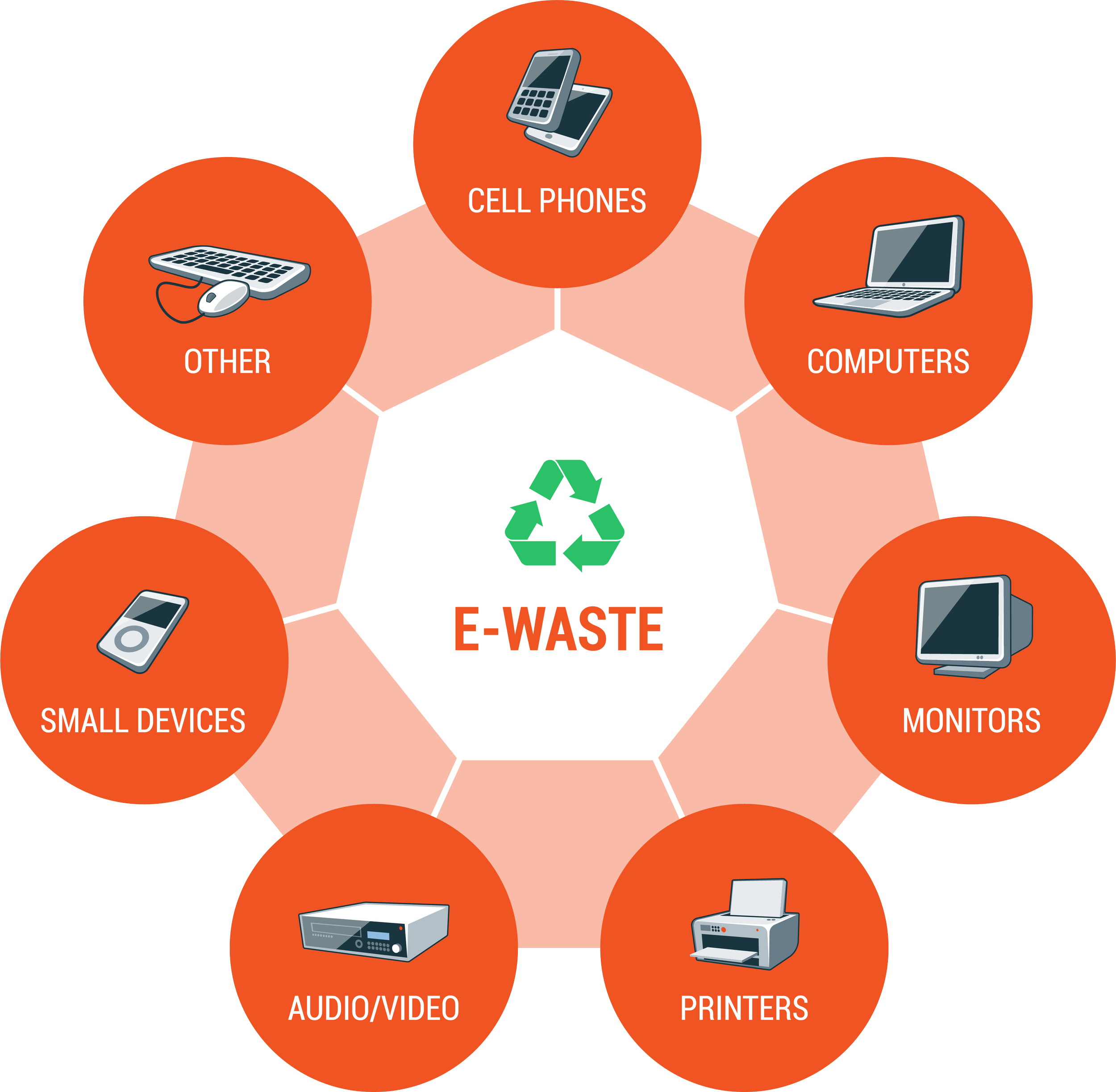Electronic waste, or more commonly known as e-waste, describes any waste from discarded electronics. Under this umbrella are broken or working electronics. An example of e-waste is a broken laptop which is thrown in a landfill.
